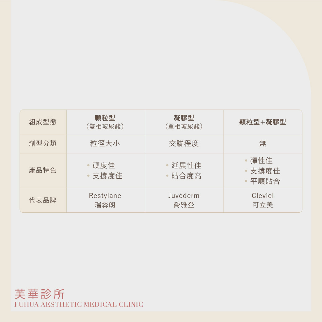 除了上述的分子大小,玻尿酸的交聯組成方式,也會使它呈現出不同型態,繼而在填補注射上發揮不同特色: