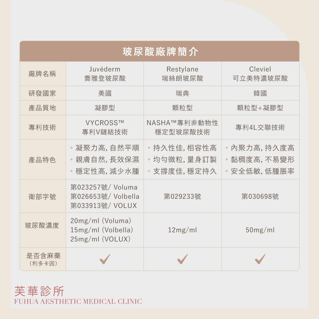目前在台灣市面上合法的玻尿酸種類繁多,其研發國家、專利科技、產品特色各有不同,以下將簡要介紹芙華所提供的玻尿酸品牌。