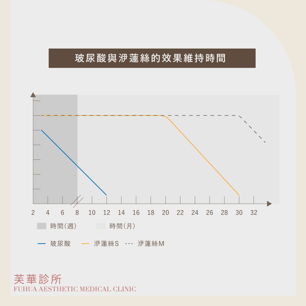 表面光滑的PCL球體能刺激自體膠原蛋白新生,取代被吸收的CMC凝膠,讓肌膚持續澎潤。根據不同劑型,洢蓮絲的效果維持時間約1~3年,實際維持時間則會隨著個人體質、生活作息、飲食習慣略有差異。