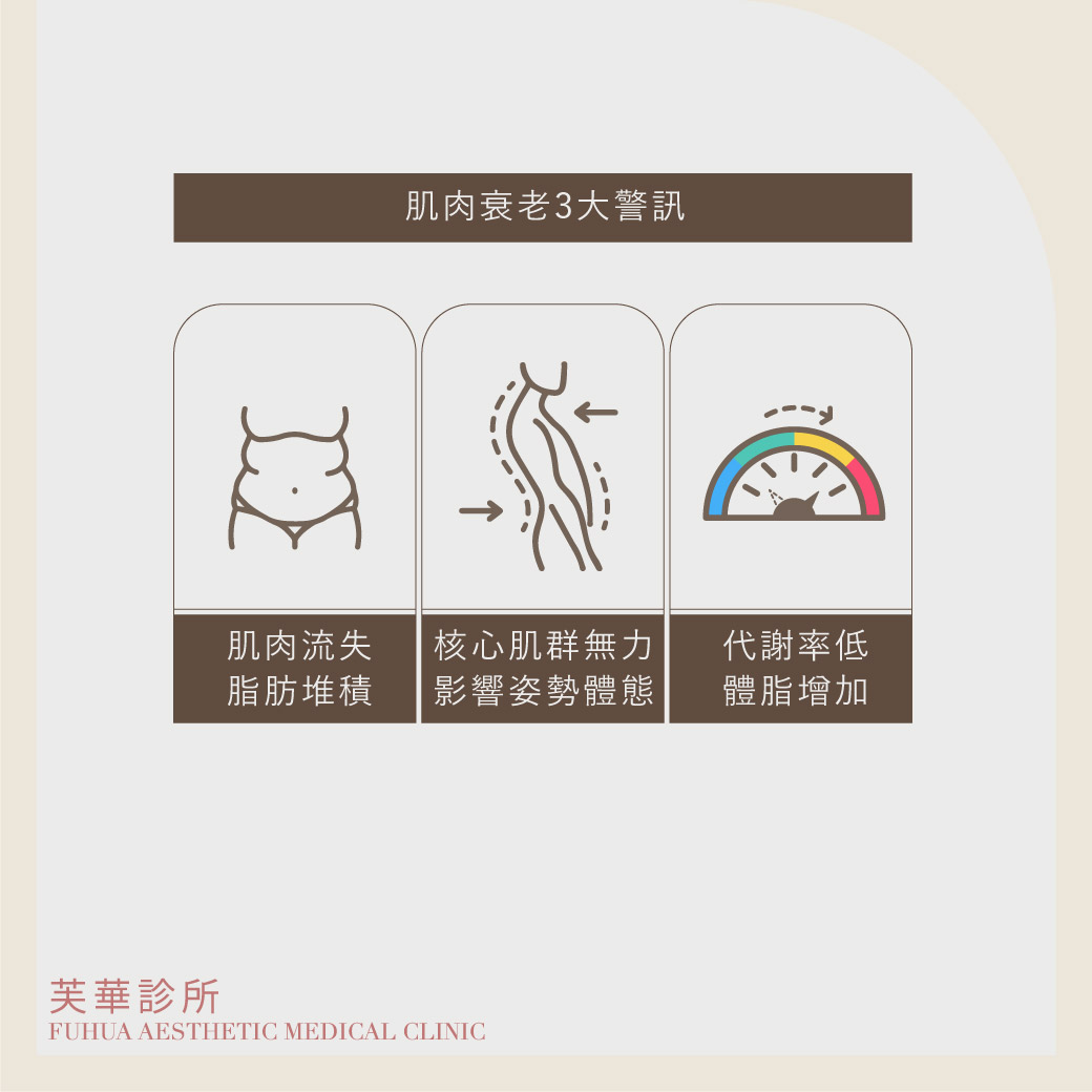 肌齡,決定人的視覺年齡!當你察覺到臉上的膠原蛋白流失時,卻無法看見深層肌肉也在逐漸流失、老化。無論男女,隨著年紀增長,肌肉逐年遞減,新陳代謝跟著下降,身體就更容易囤積脂肪。