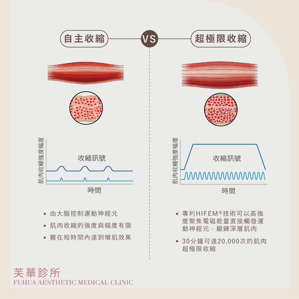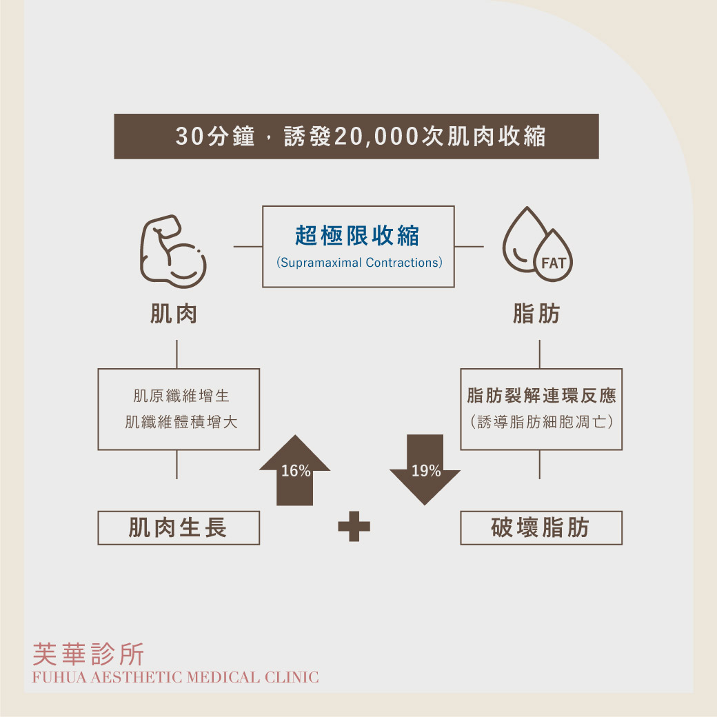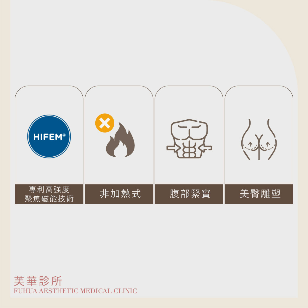 專利HIFEM®(High-Intensity Focused Electromagnetic) 高強度聚焦磁能技術,通過高頻收縮信號,刺激神經達皮下7cm的深層肌肉群,有效於30分鐘內,誘發肌肉收縮達20,000次,使肌肉完成在自主運動下無法達到的「超極限收縮(Supramaximal Contractions)」,並針對現代人最在意的「腹部」與「臀部」核心訓練。