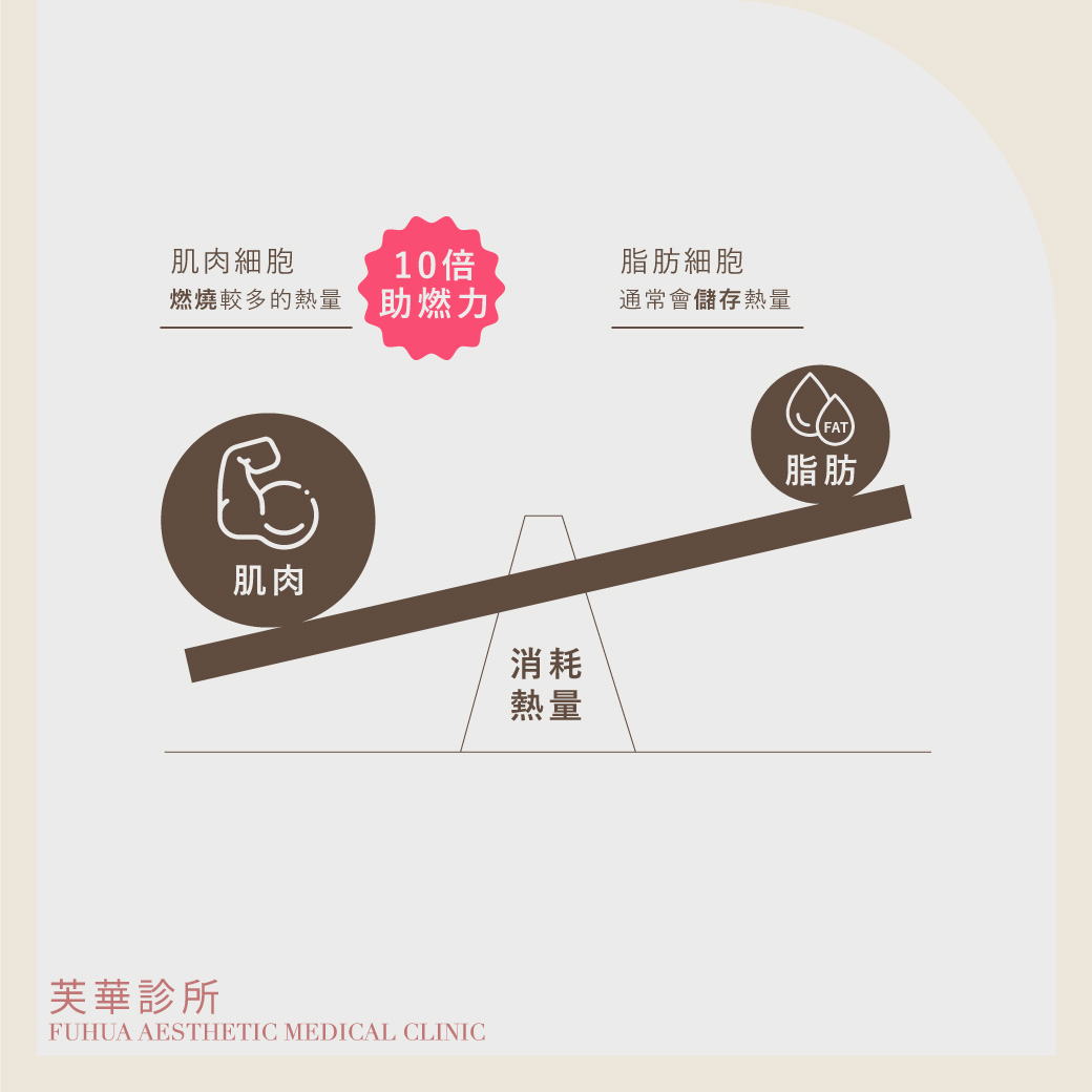 人體每公斤肌肉燃燒的卡路里,大約是脂肪的10倍!缺乏肌肉的同時,新陳代謝率也會降低,因此更容易儲存熱量。這也是為什麼久坐且無運動習慣的上班族,容易養出小腹的原因,即便照常進食或少吃,也會因為肌肉的缺乏與流失,漸漸養出泡芙體質。 尤其,相同重量的脂肪體積,是肌肉體積的3倍大!由此可知,想要追求明顯的身材曲線,除了「減脂」,「增肌」也是非常重要。提升肌肉量,不僅能提升代謝率,雕塑曲線美,更能打造不易復胖的體質。
