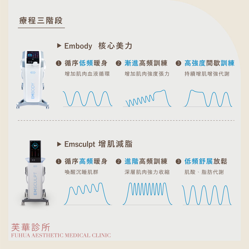 下圖將依據電磁能量的頻率與強度,介紹Emsculpt®肌動減脂與Embody®核心美力的療程三階段。建議經由專業醫師評估,並充分討論自身需求之後,制定出最理想的體雕療程。