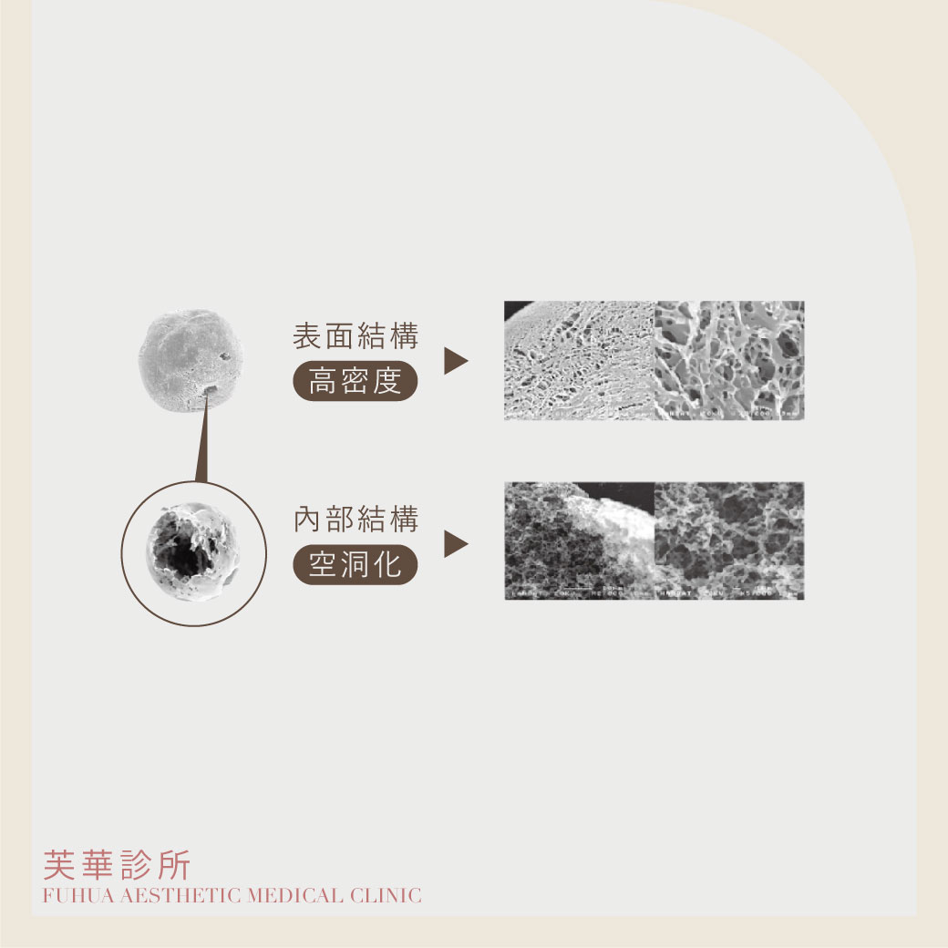 專利多孔性微球體(Microspheres),擁有高密度的表面結構,和空洞化(Spongiform)的內部結構。讓艾麗斯AestheFill®可以在肌膚底層建立穩固的「青春再生支架」,達到: