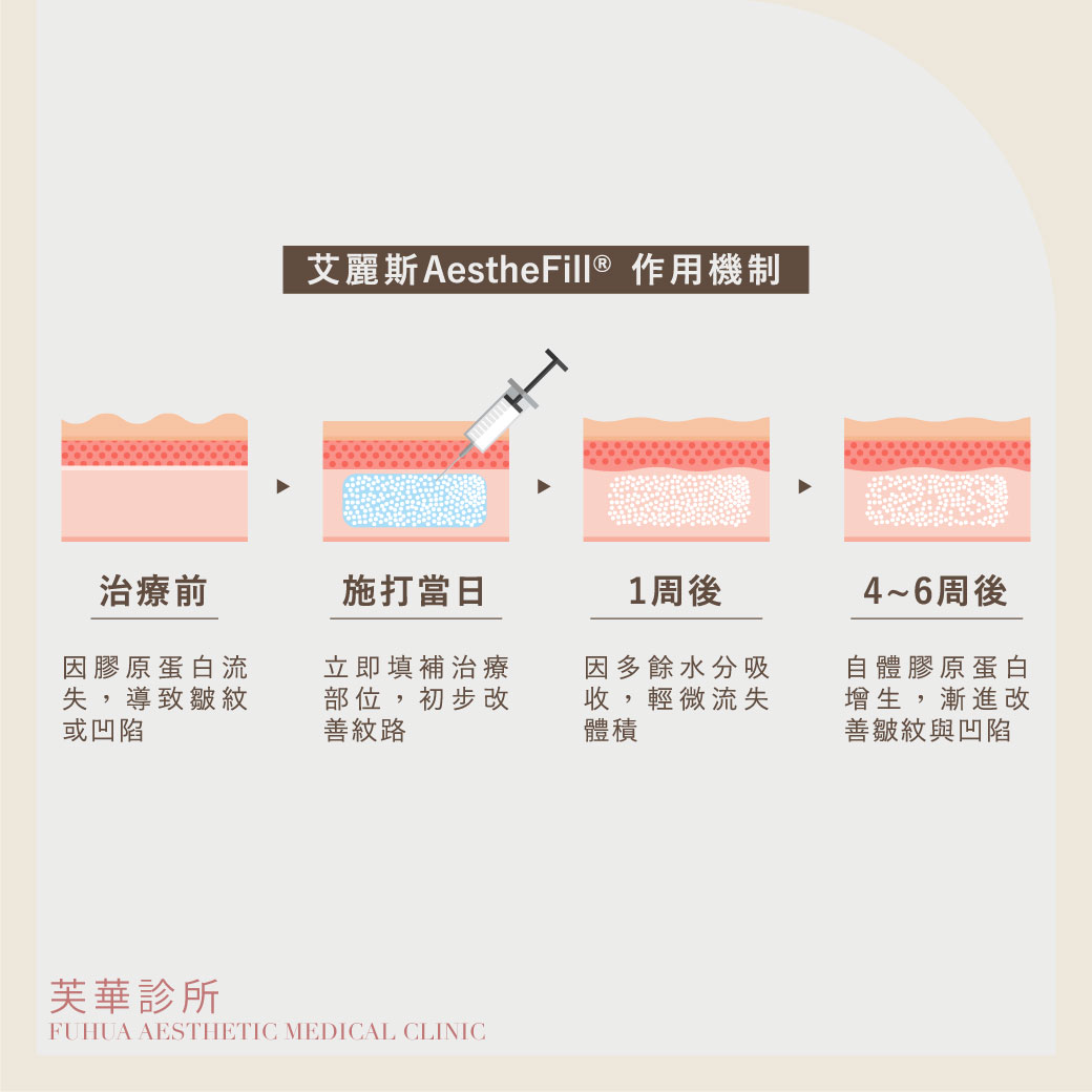 當艾麗斯AestheFill®注入真皮層後,能產生立即的填充效果,術後不易位移、無需按摩,待4~6周後,就能看見肌膚明顯恢復柔潤飽滿。