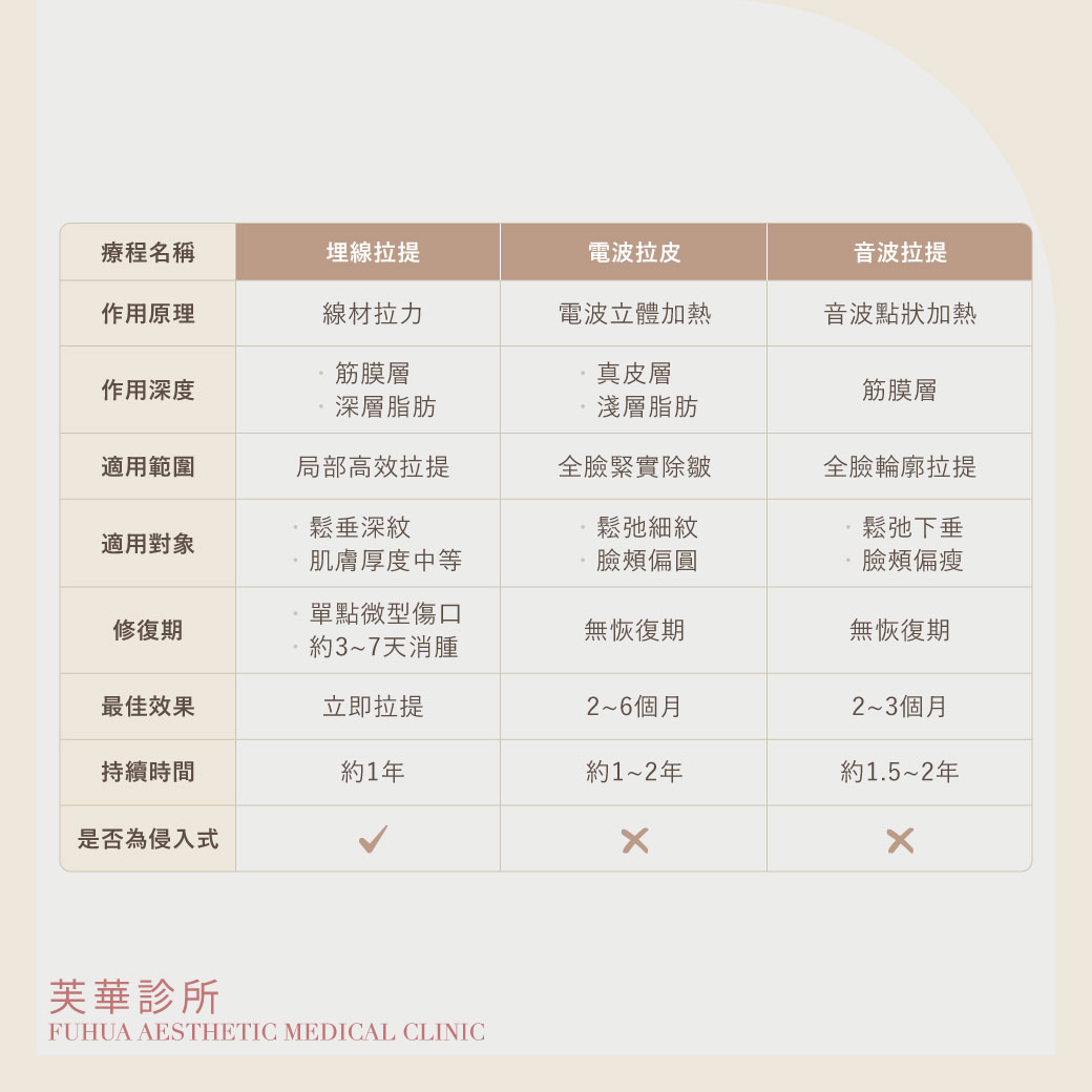 電音波是針對皮膚組織進行加熱,進而達到肌膚向內緊實的效果;埋線拉提則是以人體可吸收之線材,微創埋入皮下,透過線材本身的倒鉤設計將皮下組織向上拉提,達到除皺緊緻的效果。