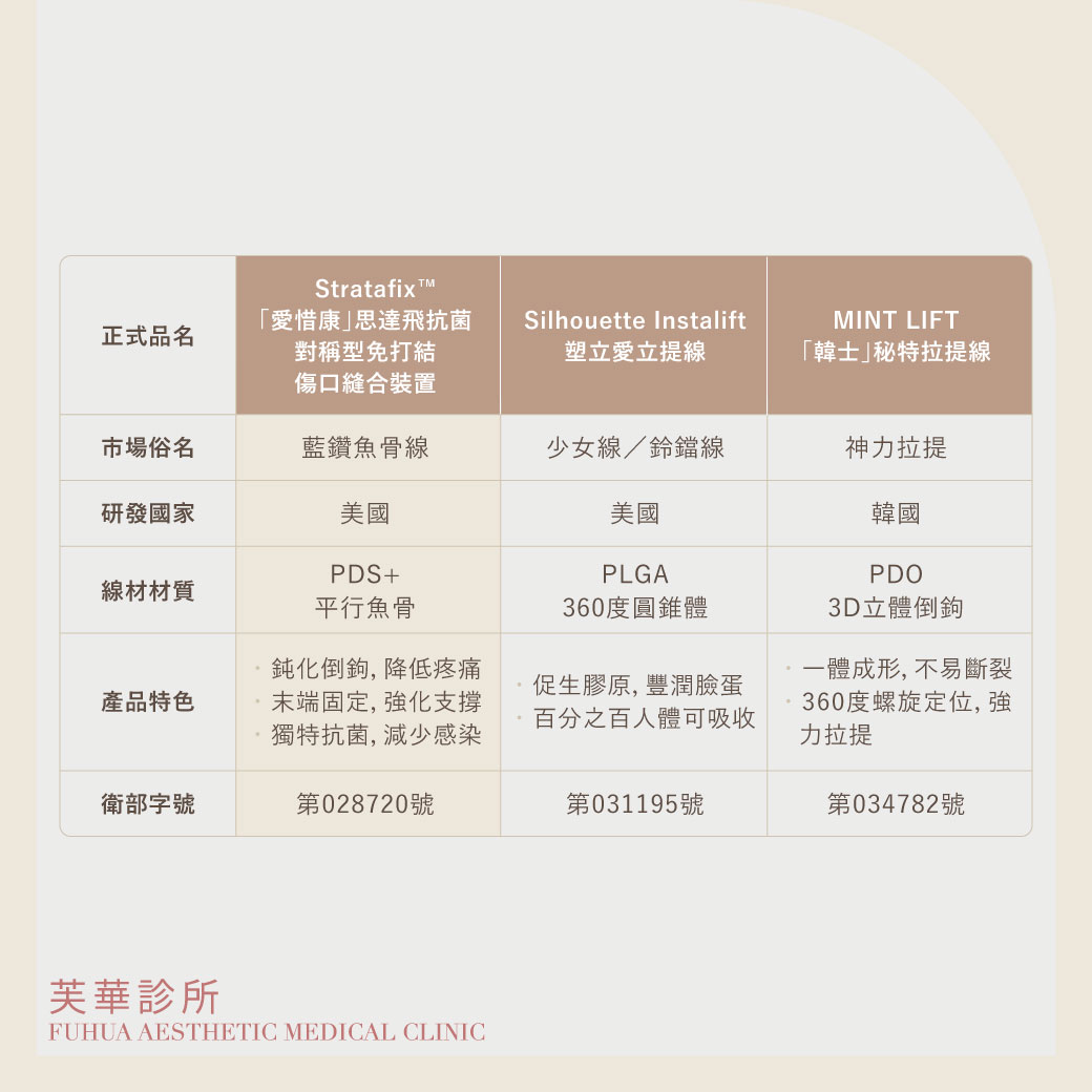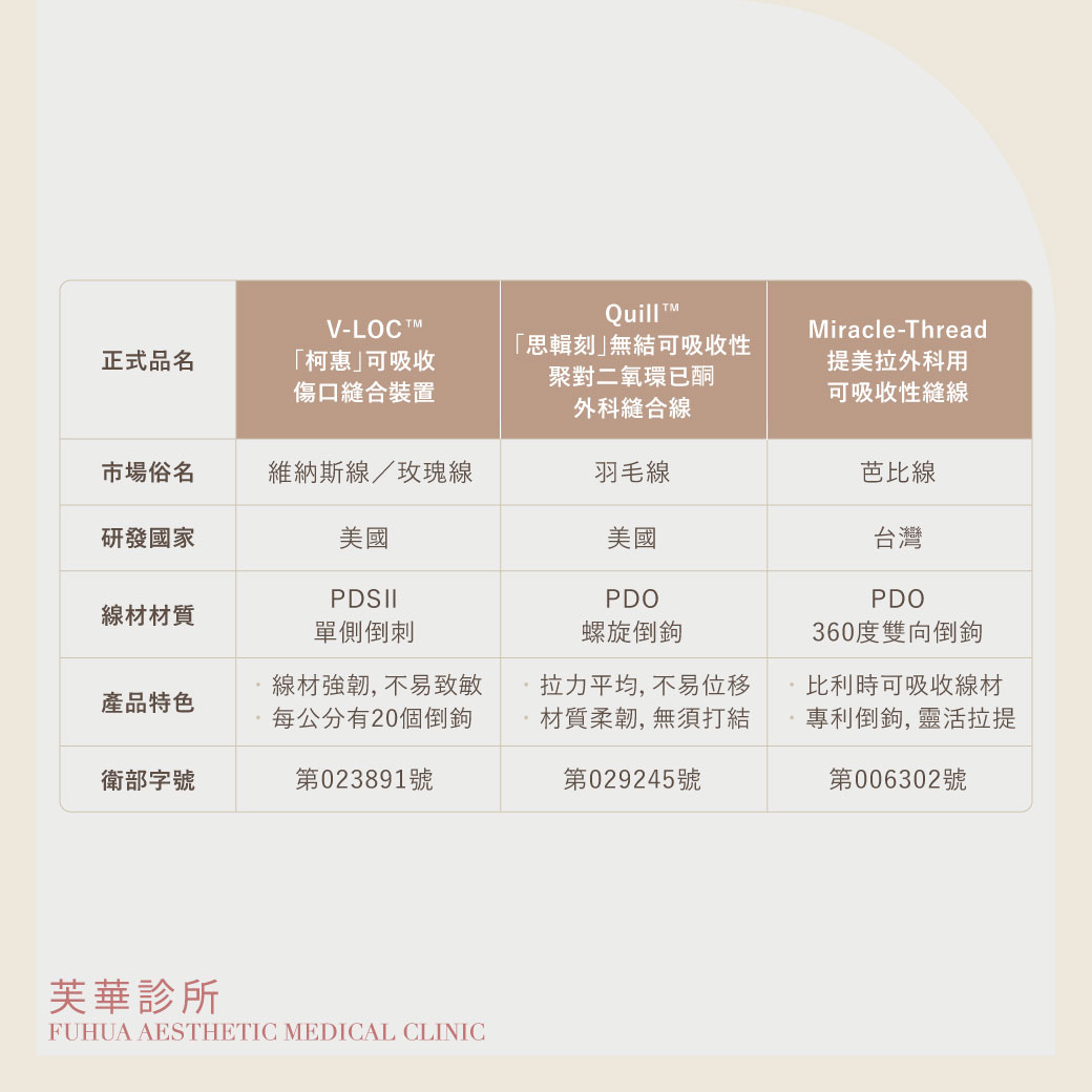 埋線拉提所使用的線材,皆為100℅人體吸收,外型上也都有倒鉤設計,只是倒鉤的形狀與分佈略有不同。目前在台灣市面上合法的線材有下列6種: